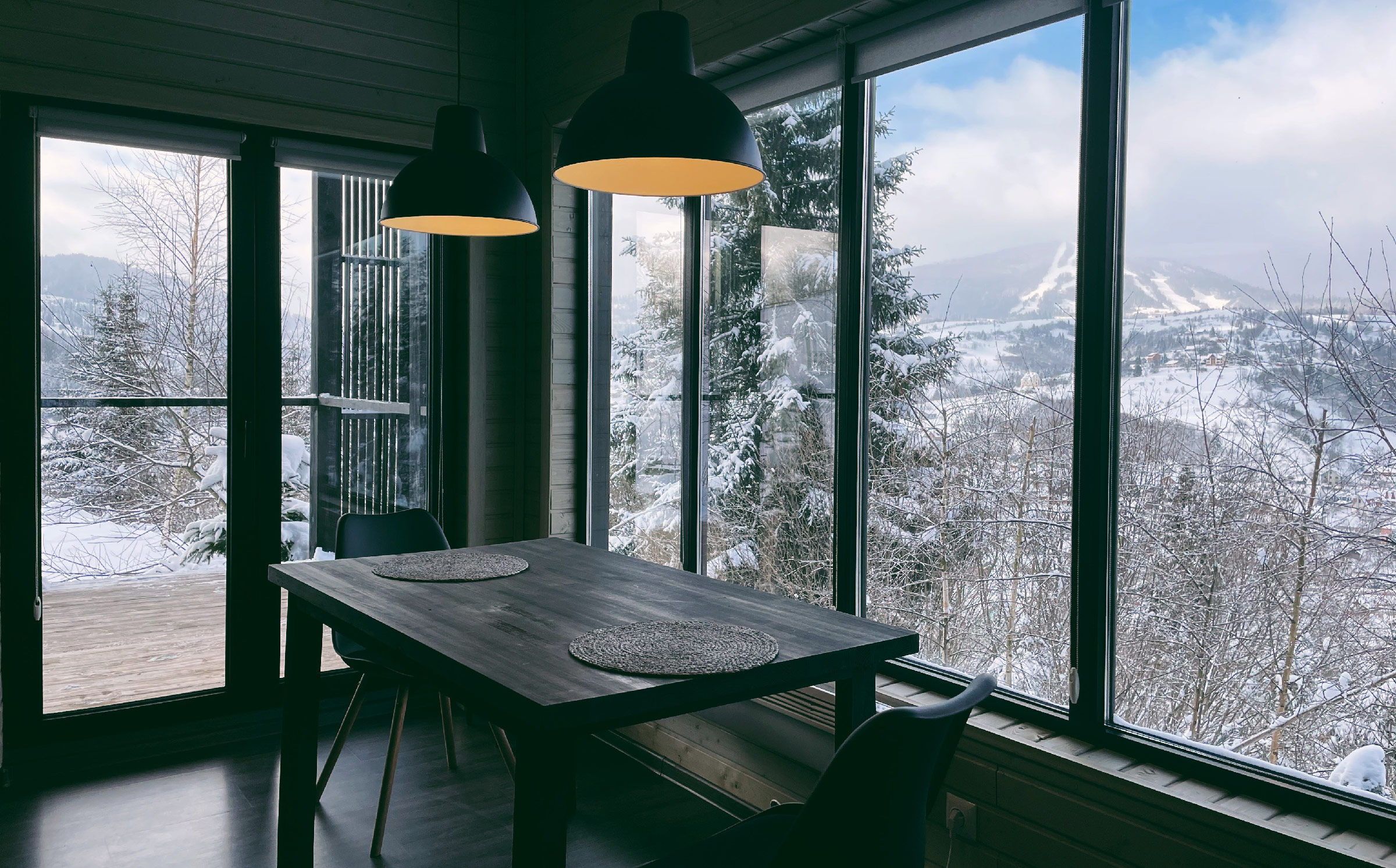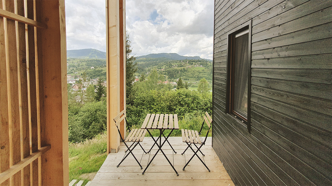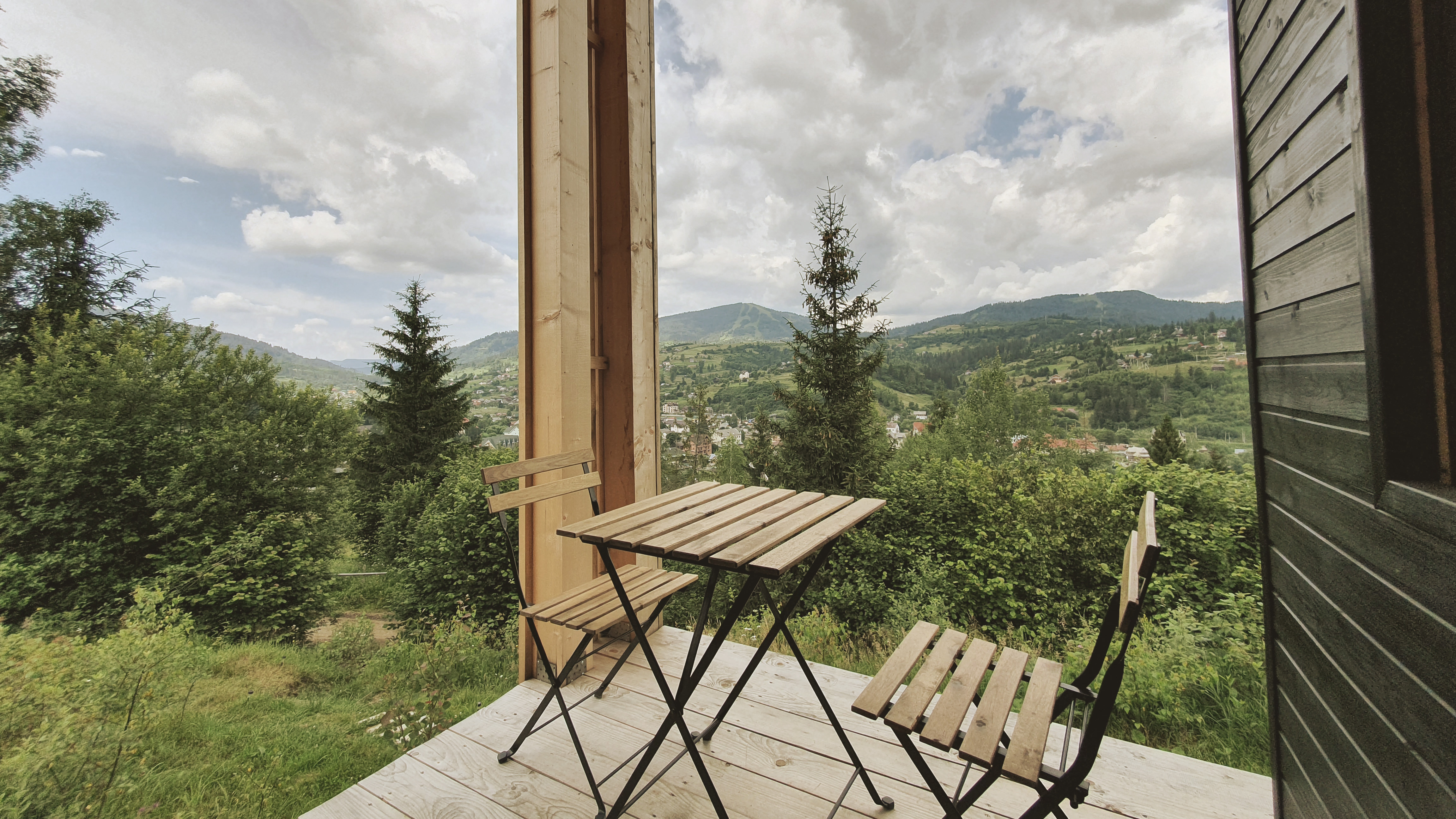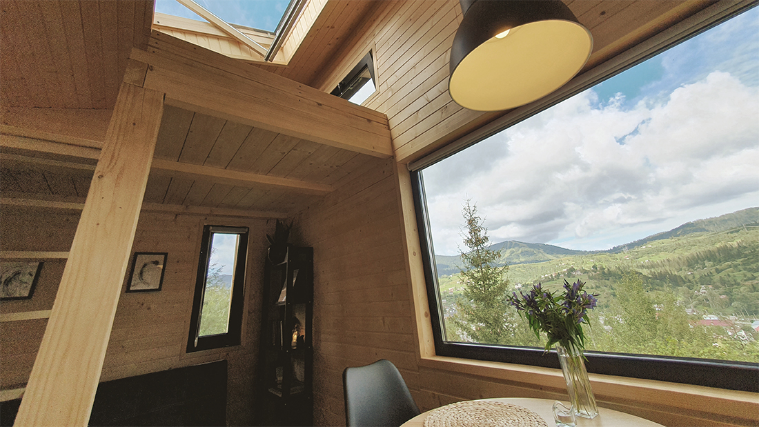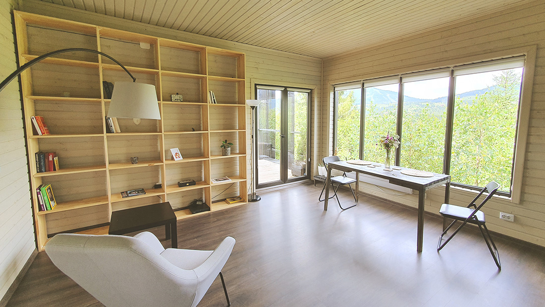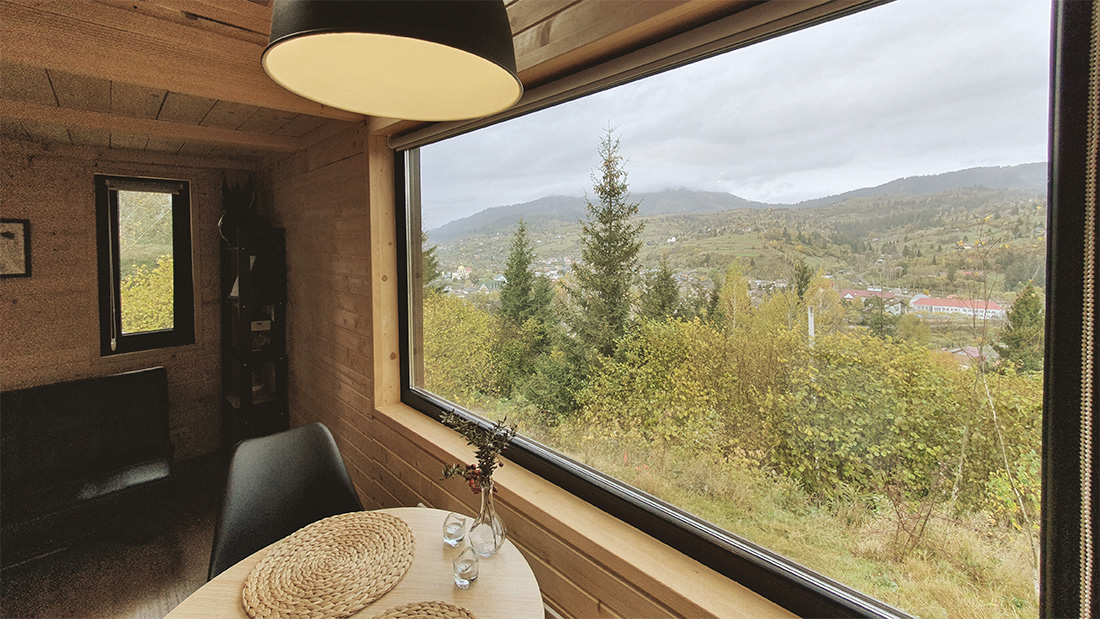 Наш перший більший котедж із величезними вікнами та просторою терасою, який розрахований на двох гостей. Багато книжок, зручні крісла, тепле освітлення. Уявіть себе з келихом вина в цій атмосфері... це кайф.